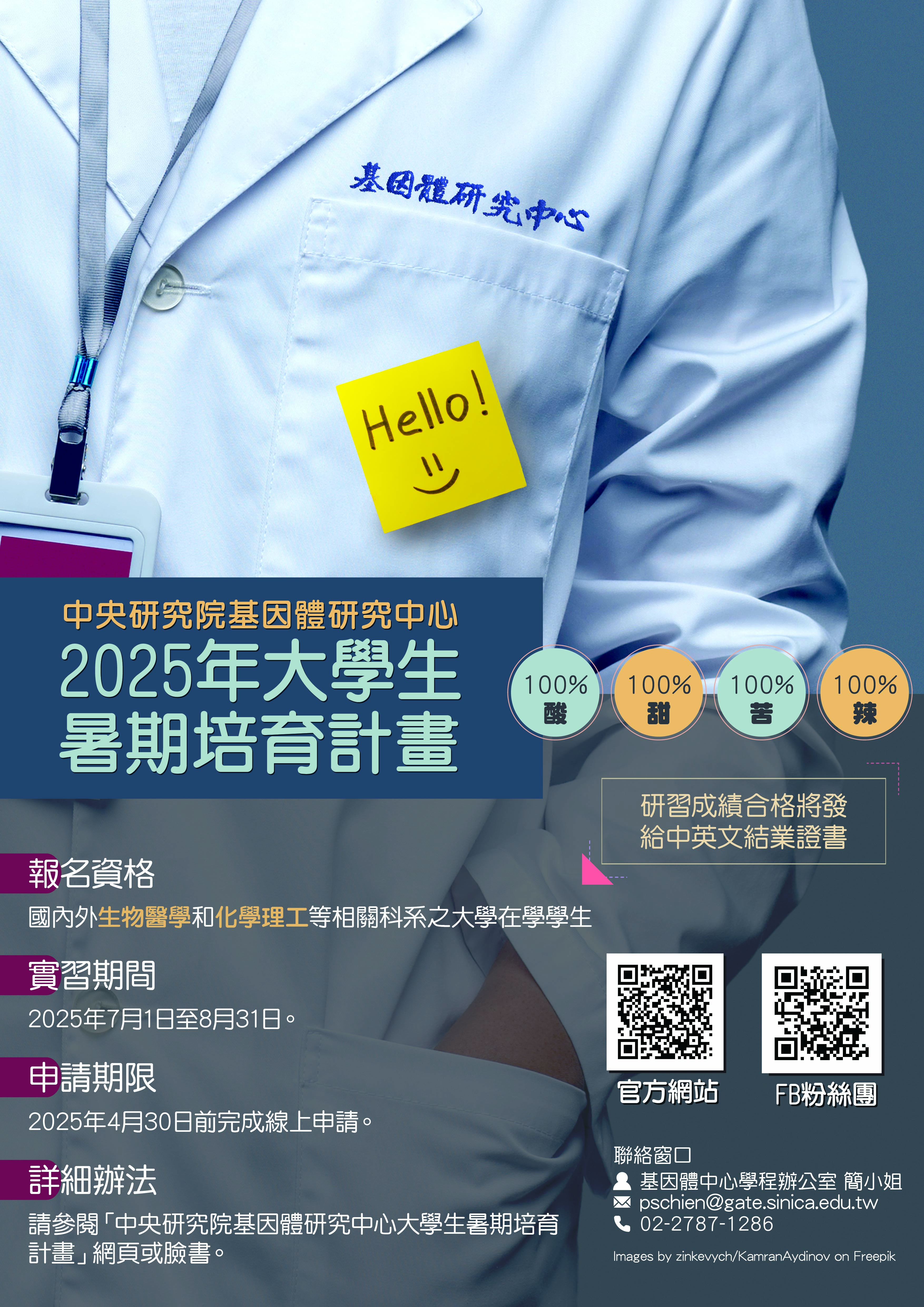 中研院基因體中心大學生暑期培育計畫 2025-04-22 最新消息 / 課程公告 一、目的:中央研究院基因體研究中心鼓勵並補助國內外生物醫學和化學理工等相關科系之大學生運用暑假期間至本中心參與專題研究計畫,以培育生醫相關領域之研究新秀。二、執行方式:提供優良環境、尖端設施及訓練課程,指導具研究潛力的大學生完成相關專題研究計畫。三、參與計畫資格:凡生物醫學和化學理工等相關科系之大學在學學生均可提出申請。(實習期間須有學生身分或有綠取通知)四、計畫執行時間:實習期間原則上為7月1日至8月31日,但實際安排將由各實驗室的規定及要求調整。五、補助項目與名額:1. 依學生出席及表現狀況,提供生活津貼每名每月至多新台幣10,000元整。2. 名額將視各實驗室的提供情況而定。3. 研習期間將提供團體意外傷害保險。若因故中途退出計畫,學生需自行承擔相關費用。六、申請辦法與期限:歡迎事先利用EMAIL主動聯繫老師,並請於4月30日前完成線上申請,申請人須註明欲參加實習的實驗室(請填寫至少一個,至多共三個),並提供簡短的參與動機及預期目標說明,同時附上相關的修課成績、經歷、推薦函或其他可增加錄取機會文件尤佳。如有推薦函,請師長於4月30日報名截止日期前EMAIL推薦函電子檔予簡小姐( pschien@gate.sinica.edu.tw)。七、錄取結果:錄取名單於5月下旬在暑期大學生網頁與本中心網頁公告,並個別以電子郵件寄發錄取通知。八、結業證書:學生完成計畫並經指導教授審核同意後,本中心將核發中英文結業證書。此外,期末成果發表競賽暨結業式時,將另外頒發獎狀予成績優異者。 📅 🔥 申請截止日:4/30!🔥📢 詳細資訊與申請方式請見 👉 https://grcintern.genomics.sinica.edu.tw/ ⚡ 還在等什麼?機會不等人,快來報名,讓這個夏天變得超有價值! FB: https://www.facebook.com/grc.summer You Might Also Like 115學年度碩士班、博士班甄試入學,歡迎踴躍報考! 2025-10-27 公告114-2學期選課報報 (12/3起開放預排功課表功能) 2025-12-03 114-1「系所主任與班代及系學會代表有約」座談會會議紀錄及建議事項 2025-10-30
