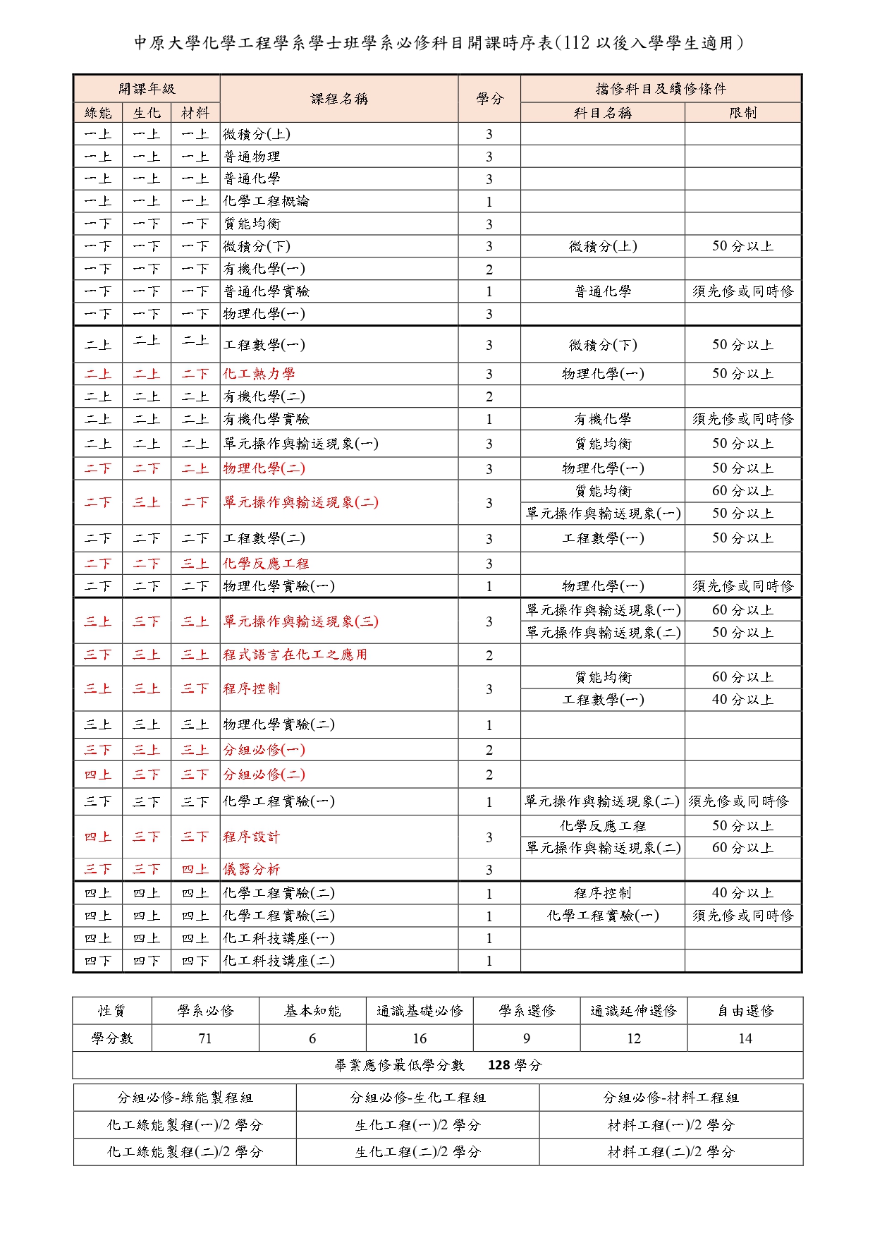 中原大學化學工程學系學士班學系必修科目開課時序表(三組彙整) 適用112入學以後 2025-09-01 最新消息 / 課程公告 You Might Also Like 115學年度碩士班、博士班甄試入學,歡迎踴躍報考! 2025-10-27 114學年度第1學期「系主任與班代有約」座談會意見處理表 2025-12-03 114-1「系所主任與班代及系學會代表有約」座談會會議紀錄及建議事項 2025-10-30