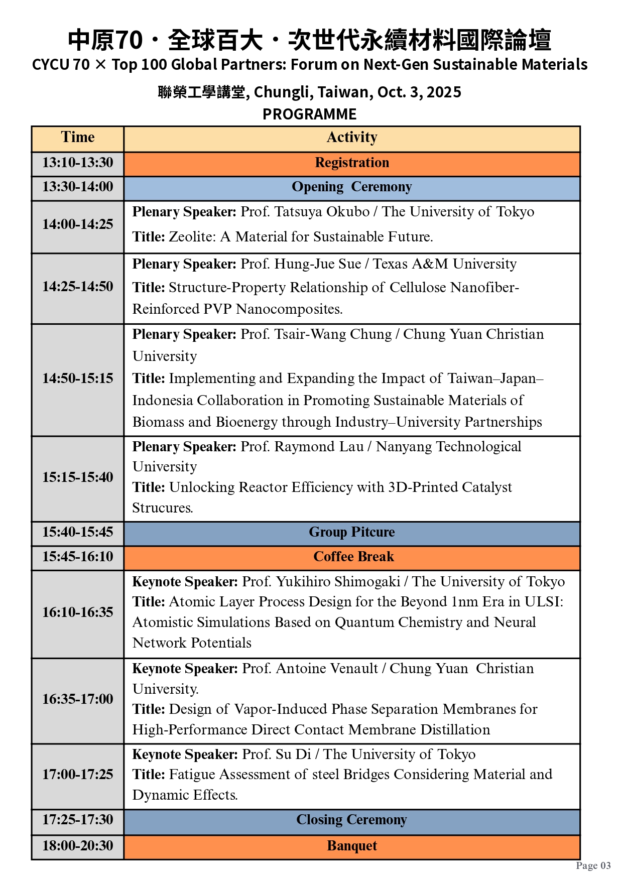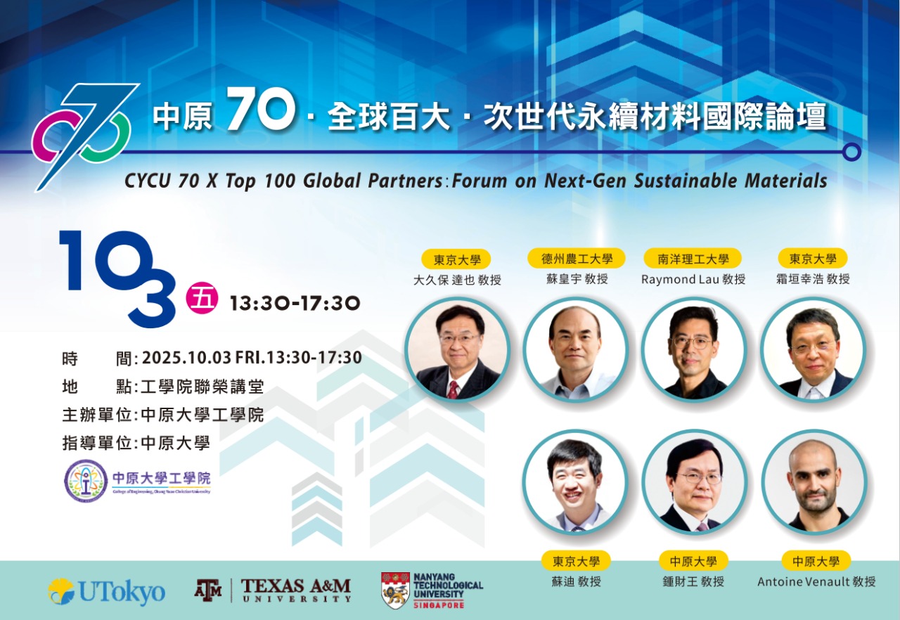中原70.全球百大.次世代永續材料國際論壇 2025-09-03 最新消息 / 活動公告 工學院為配合中原70邁向永續校慶活動,持續推展多元化國際交流、國際合作、國際學生交換計畫,並貫徹國際工程教育認證的精神與規範,達成全球接軌與拓展國際知名度的目標。本次論壇邀集東京大學、德州農工大學、南洋理工大學及中原大學等全球頂尖學者,共同探討「次世代永續材料」之研究與應用,議程涵蓋材料科學、能源、製程技術以及工程應用等多元主題,透過主題演講活動與合作交流,展現跨國產學合作推動永續發展的成果與願景,並推動次世代永續材料之發展。~歡迎師生踴躍報名參加~•報名網址:https://itouch.cycu.edu.tw/go/?w=13984@acpm3 You Might Also Like 114學年度第1學期「系主任與班代有約」座談會意見處理表 2025-12-03 115學年度碩士班、博士班甄試入學,歡迎踴躍報考! 2025-10-27 114-1「系所主任與班代及系學會代表有約」座談會會議紀錄及建議事項 2025-10-30