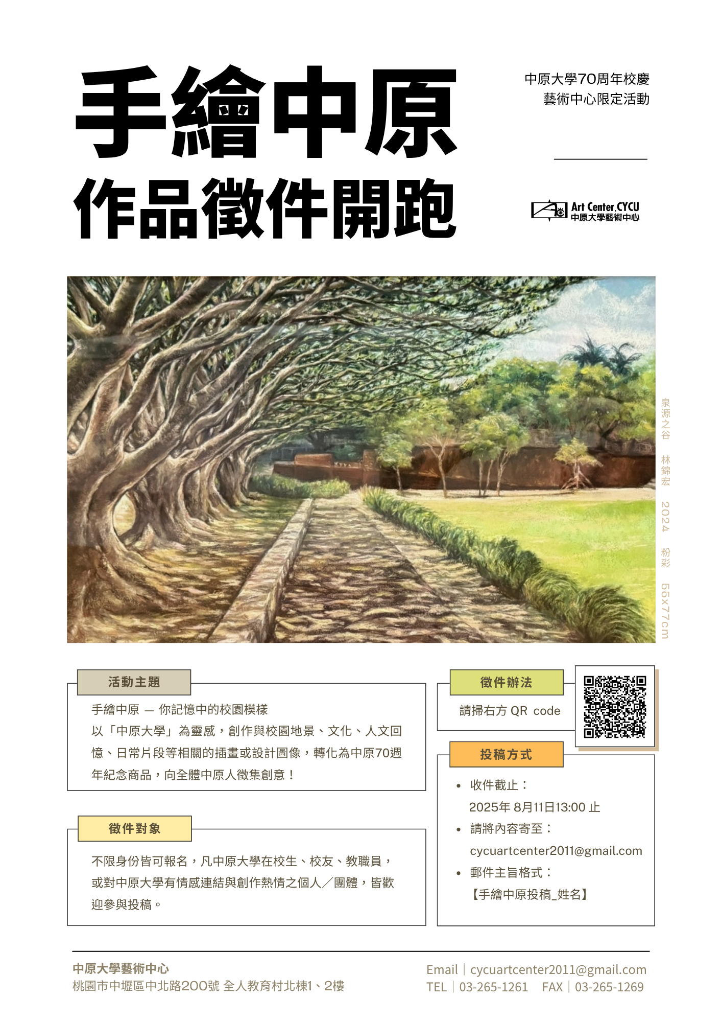 中原70—《手繪中原》徵件活動 2025-07-22 70周年系慶 / 最新消息 You Might Also Like 懇請已採銀行匯款、ATM轉帳之學長(姐)協助提供您匯款日期、匯款金額、帳號後五碼 2025-09-02 化工系返校報到方式及抽獎大放送! 2025-10-09 中原化工70周年系慶-活動流程及紀念品資訊 2025-07-24