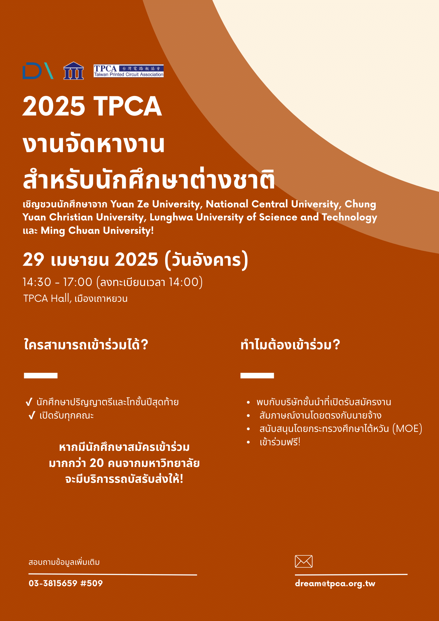 台灣電路板協會(TPCA)邀請國際生參加留用說明會暨媒合會 2025-03-17 最新消息 / 活動公告 台灣電路板協會(TPCA)承接資策會計畫,將於4/29假協會舉辦”在臺國際生的留用說明會暨媒合會”,當天議程會邀請教育部長官、資策會夥伴及TPCA代表等致詞與分享,並邀請多家會員廠商前來媒合招募,希望能將優秀人才留在台灣就業,邀請即將畢業的國際生來參與!時間:114.04.29(二)14:30-17:00(14:00報到)地點:台灣電路板協會(TPCA),滿20人可提供免費接駁車學生:科系不限,即將畢業者優費用:全程免費*請同學帶著履歷前來即可*詳細資訊可見官網:https://www.tpca.org.tw/Message/MessageView?id=26854&mid=60 You Might Also Like 114-1「系所主任與班代及系學會代表有約」座談會會議紀錄及建議事項 2025-10-30 114學年度第1學期「系主任與班代有約」座談會意見處理表 2025-12-03 公告114-2學期選課報報 (12/3起開放預排功課表功能) 2025-12-03