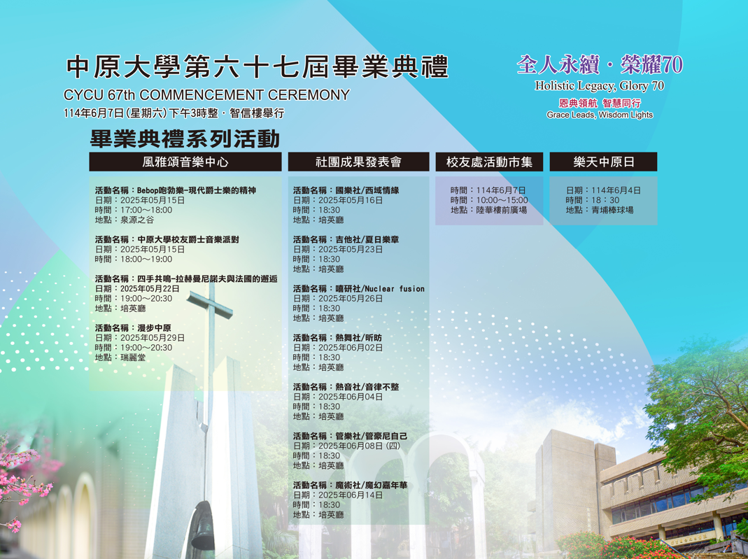歡迎各位踴躍參與畢業典禮系列活動! 2025-05-27 最新消息 / 活動公告 You Might Also Like 114學年度第1學期「系主任與班代有約」座談會意見處理表 2025-12-03 公告114-2學期選課報報 (12/3起開放預排功課表功能) 2025-12-03 115學年度碩士班、博士班甄試入學,歡迎踴躍報考! 2025-10-27