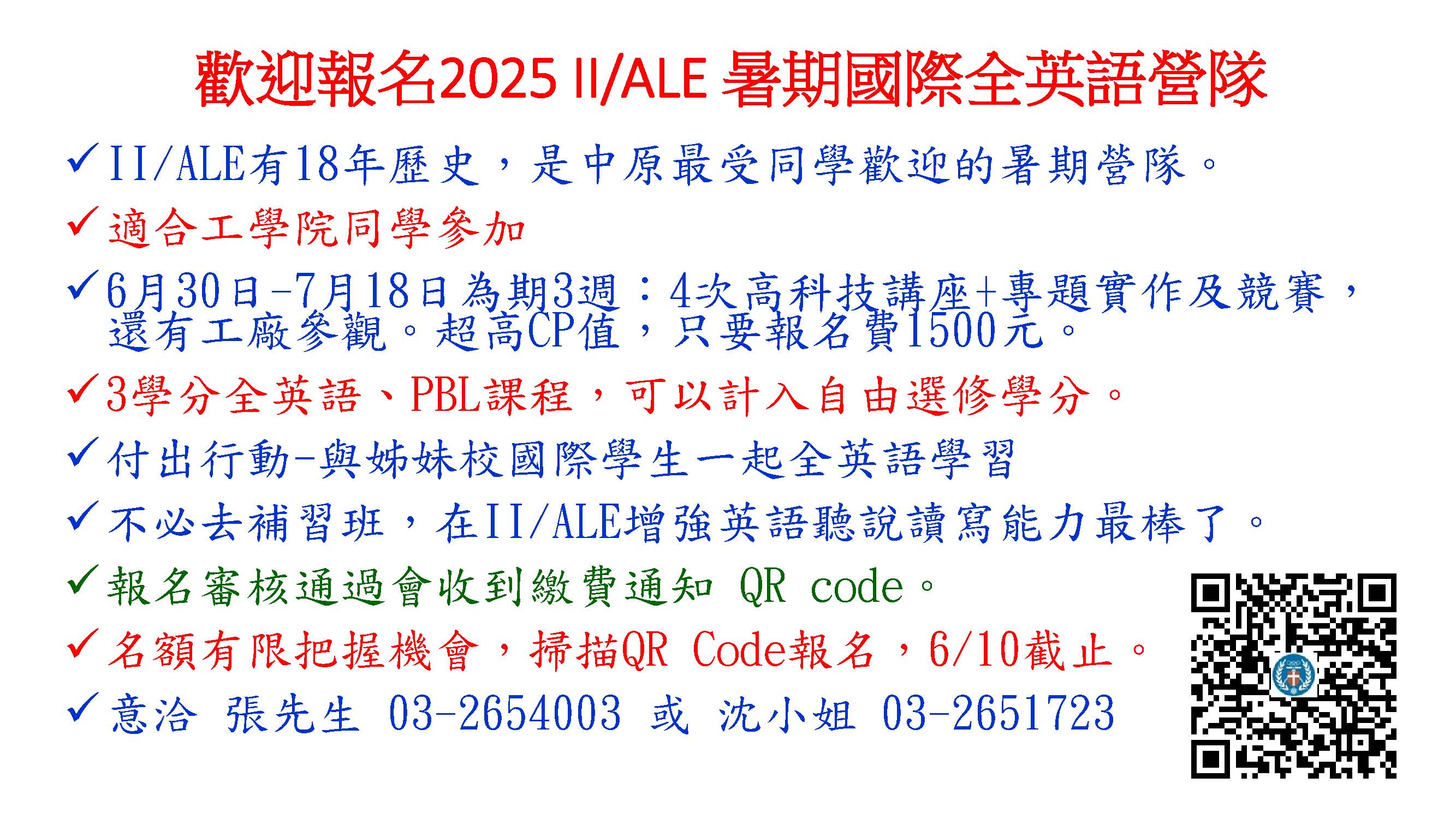 歡迎報名2025 II/ALE暑期國際全英語營隊! 2025-04-09 最新消息 / 活動公告 You Might Also Like 114學年度第1學期「系主任與班代有約」座談會意見處理表 2025-12-03 公告114-2學期選課報報 (12/3起開放預排功課表功能) 2025-12-03 114-1「系所主任與班代及系學會代表有約」座談會會議紀錄及建議事項 2025-10-30