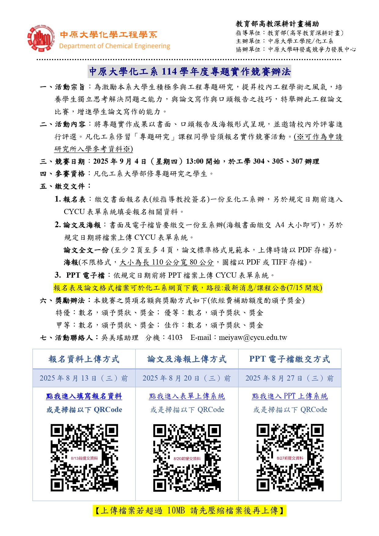 114學年度化工系專題實作競賽實施辦法(包含報名表及論文格式下載) 2025-07-15 最新消息 / 課程公告 本系專題實作競賽訂於2025年9月4日(星期四)舉行,於工學304、305、307辦理,請修習大四「專題研究」課程之同學務必完成報名,並依據公告時程繳交相關競賽資料與文件,詳細內容請參閱附件說明。 註:已修習「專題研究」課程但未報名參加本次專題實作競賽者,須辦理「課程期中停修申請」。 專題實作競賽格式檔案下載: 中原大學化工系114學年度專題實作競賽施辦法0804 114學年度專題實作競賽書面報名表0709 114學年度中原大學化工系專題實作論文格式說明1140709 You Might Also Like 115學年度碩士班、博士班甄試入學,歡迎踴躍報考! 2025-10-27 114-1「系所主任與班代及系學會代表有約」座談會會議紀錄及建議事項 2025-10-30 公告114-2學期選課報報 (12/3起開放預排功課表功能) 2025-12-03
